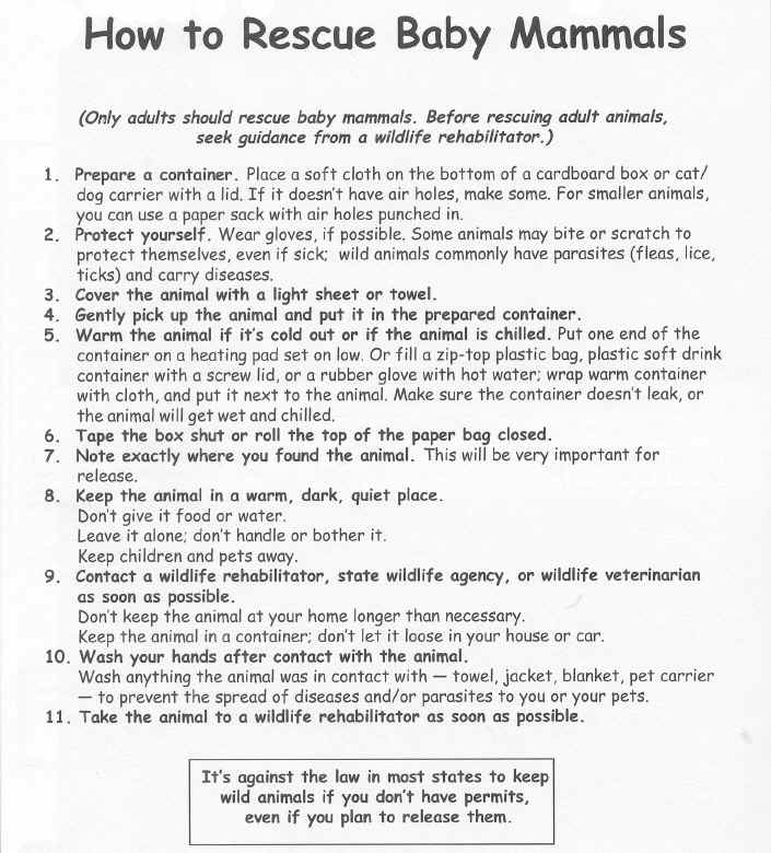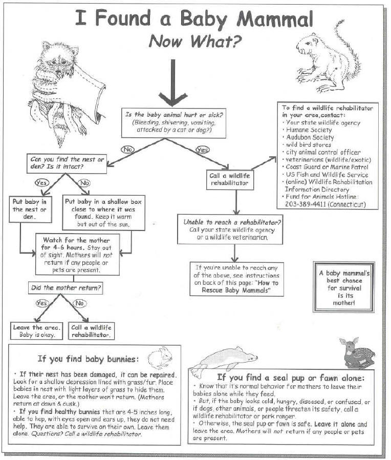 If you believe a baby is truly orphaned or an animal has an injury do NOT leave it on the ground. The only thing that will find it is maggots, flies and bugs and predators ( probably) cats).